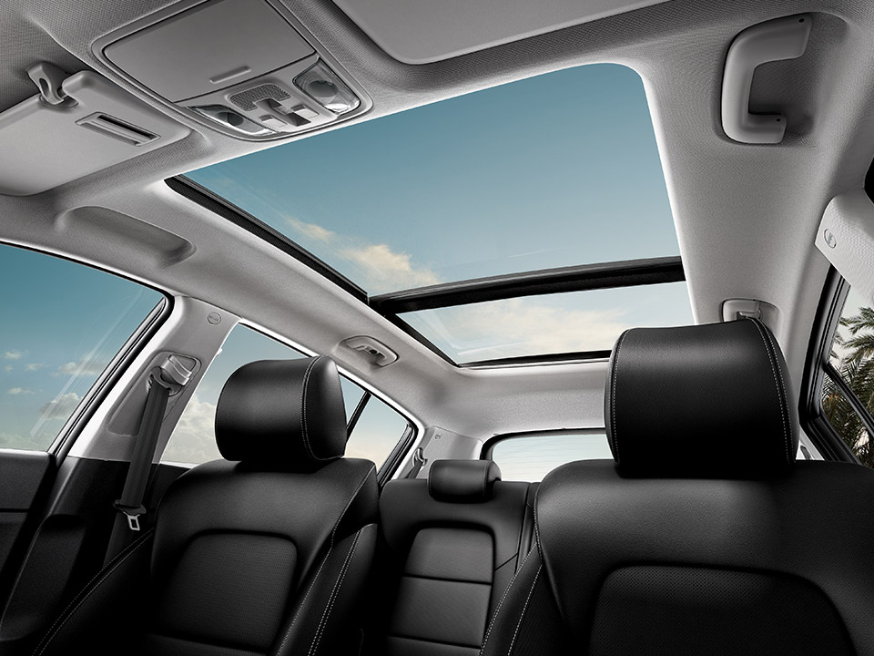 - Quad LED fog lamps, dual exhaust pipes, front & rear skid plates, touches of satin chrome and distinctive GT Line 19-inch alloy wheels add impact to the Sportage's eye-catching exterior.